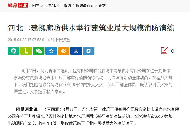河北新闻网等多家媒体报道我消防实战演练 来源: 修改时间:2015.04.23 浏览:7332 河北新闻网等多家媒体报道我消防实战演练 2015年4月22日,公司在廊坊地表水厂组织了一次施工现场消防应急救援实战演练。来自业主、监理和劳务队的400多人参加了此次活动。 当日,河北新闻网、河北安全生产杂志、网易河北、廊坊电视台、廊坊日报等多家新闻媒体对此进行了报道。(闫子明) 上一条 返回列表 河北二建:下一条
